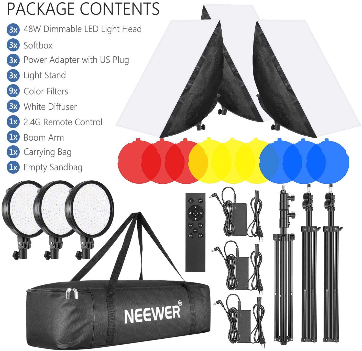 Puissance de sortie : 48 W Flux lumineux : 4800LM Température de couleur : 3200K-5600K Luminosité réglable : 10% -100% Entrée d'alimentation CC: DC13-19V Batterie au lithium : NP-F550/750/970 (non inclus)