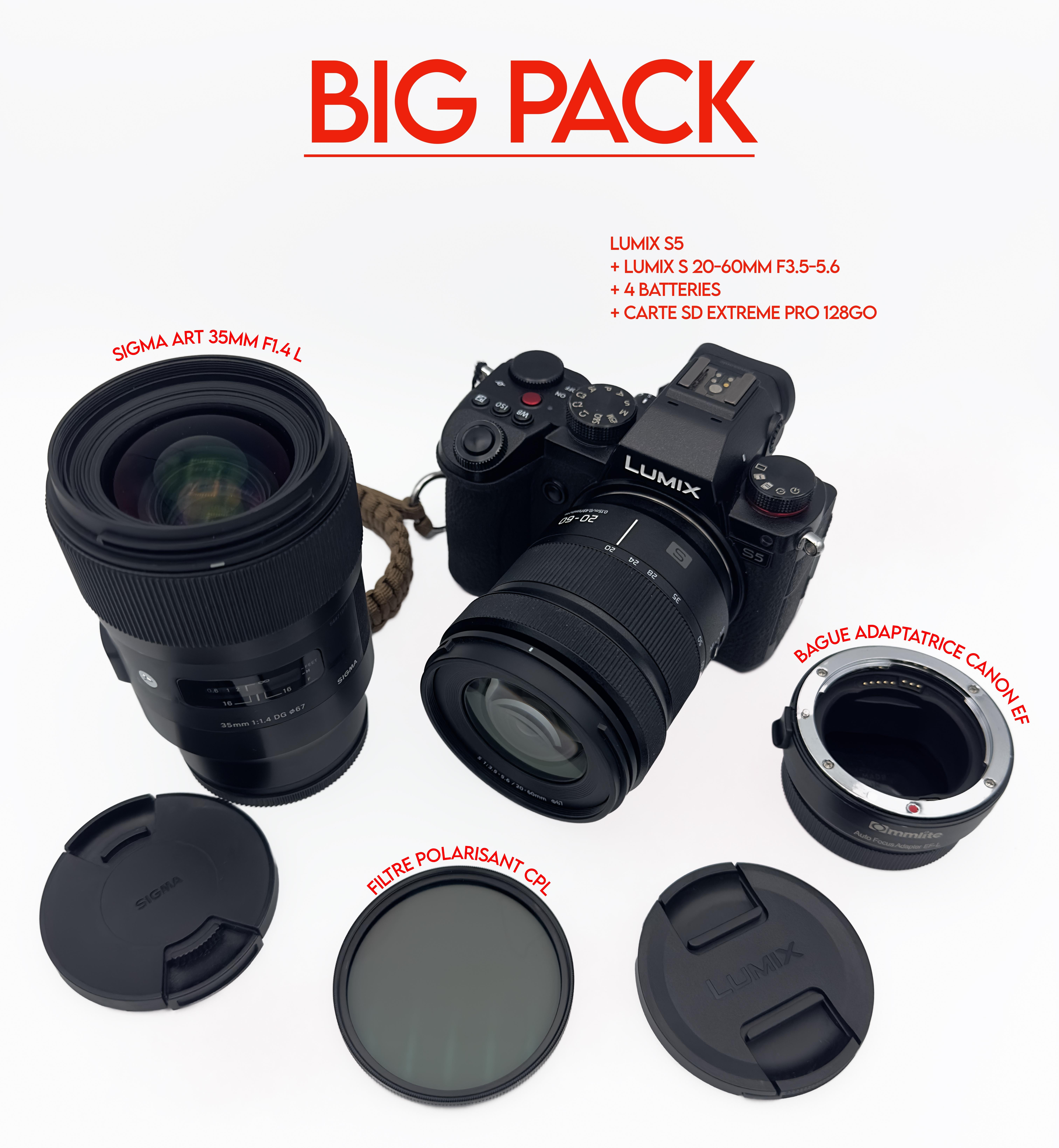 Dans ce "BIG PACK" vous avez le boîtier LUMIX S5 et 2 objectifs: Lumix S5 (capteur plein format, double stabilisation, enregistrement 4K 60p/30p, double slot SD...) Lumix S 20-60mm f3.5-5.6 (objectif zoom très léger) SIGMA Art 35mm f1.4 (Lifestyle, Mariage, Mode, Photo de rue, Portrait, Paysage, Reportage, Vlog, voyage) Bague adaptatrice pour monture Canon EF 4 batteries 1 chargeur de batteries 1 filtre polarisant CPL Sac de transport _ 1 carte SD Extreme Pro 128Go 170mb/s